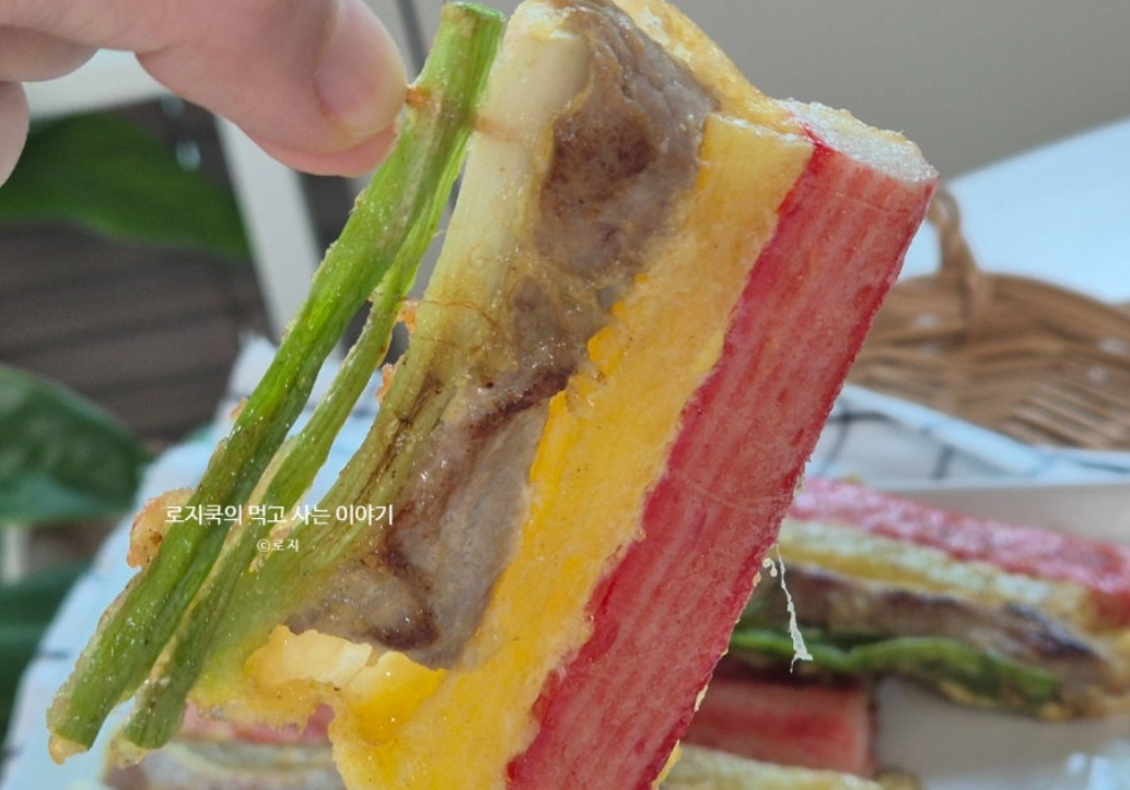 삼색꼬치전: 돼지고기 안심 + 단무지 + 게맛살 (3가지 재료)
