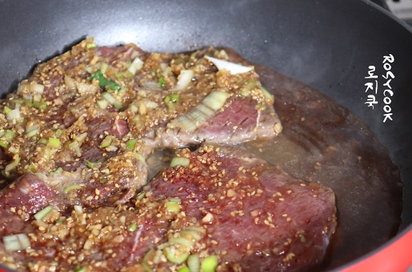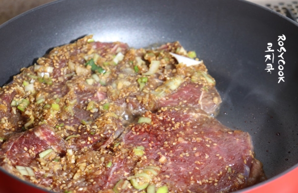 22. 중불에서 천천히 구워줍니다. 양념 때문에 탈 수 있기 때문에 물을 살짝 부어서 구워주시면 됩니다. 소고기 돼지고기 동일하게 구워주고, 양념을 조리면서 고기를 익혀줍니다.