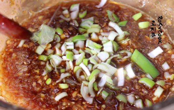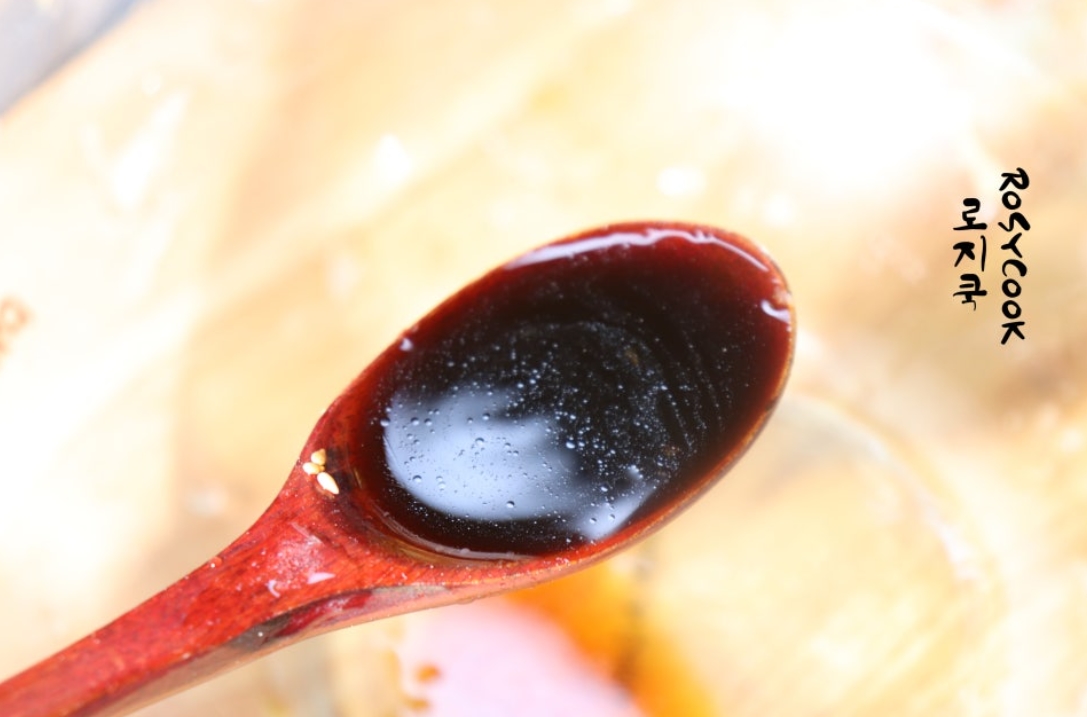 15. 양조간장 5 큰 술을 넣고 맛술 3 큰 술을 넣어줍니다.