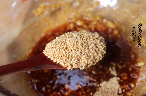 7. 참깨 1 큰 술을 넣어주시고 후춧가루 3번 톡톡 뿌려줍니다.