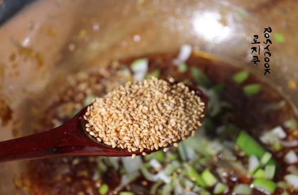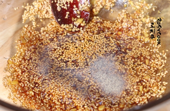 7. 참깨 1 큰 술을 넣어주시고 후춧가루 3번 톡톡 뿌려줍니다.