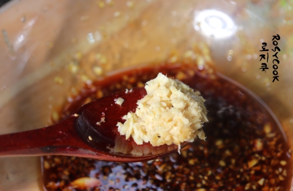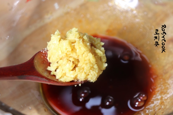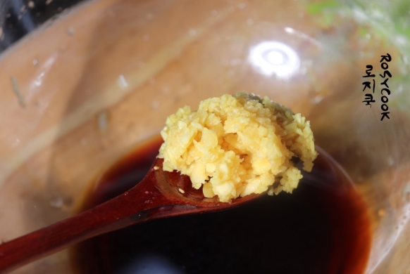 6. 간 마늘 1 큰 술과 간생강 1/4 큰 술, 맛술 2 큰 술을 넣어줍니다.