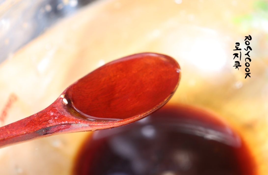15. 양조간장 5 큰 술을 넣고 맛술 3 큰 술을 넣어줍니다.