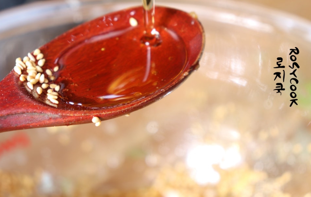 19. 후춧가루 3번 톡톡 뿌리고, 참기름 1 큰 술을 넣어주시면 돼지고기 산적 양념도 끝입니다.