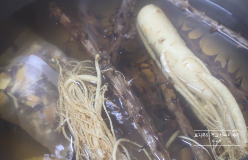 6. 물을 부어주시고, 삼계탕 닭에 있는 황기 백숙용 팩을 넣어줍니다. 엄나무와 인삼도 함께 넣어줬습니다. 엄나무는 생략 가능합니다. 30분 ~ 40분 정도 국물에 약재들이 우러나도록 끓여줍니다.