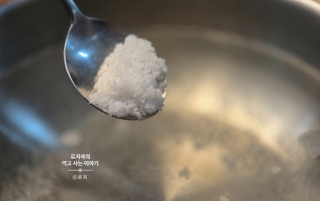 3. 물을 끓여주시고, 펄펄 끓어오르면 굵은소금을 넣어줍니다.