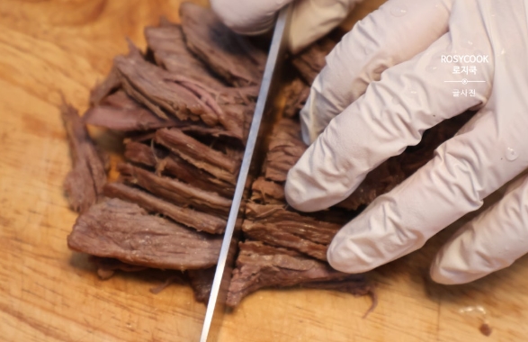 9. 장조림 간장에 삶은 한우 소고기 양지를 적당한 크기로 썰어줍니다. 찢어주셔도 됩니다.