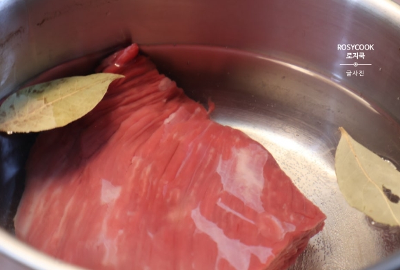 1. 소고기 양지가 잠길 정도로 물을 붓고 월계수잎과 고기를 넣어줍니다.