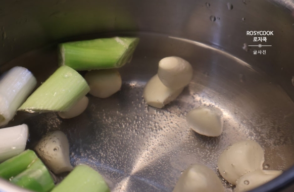 4. 물을 붓고, 대파와 마늘을 넣어줍니다.