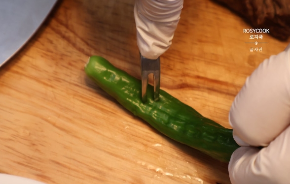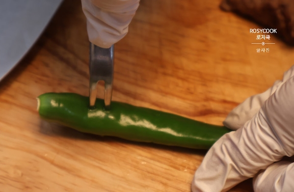 8. 청양고추와 꽈리고추의 꼭지를 딴 후 준비해 줍니다. 포크로 콕콕 찔러 구멍을 내줍니다. 양념이 더 잘 배도록 하는 것입니다.