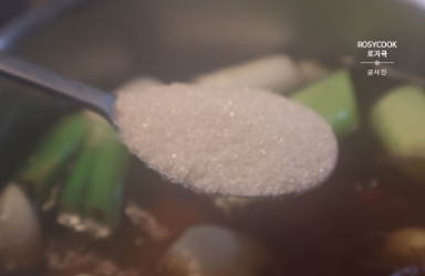6. 진간장과 설탕을 넣고 맛술을 부어줍니다.