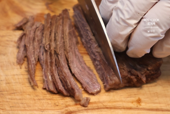 9. 장조림 간장에 삶은 한우 소고기 양지를 적당한 크기로 썰어줍니다. 찢어주셔도 됩니다.