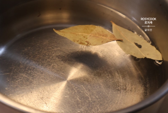 1. 소고기 양지가 잠길 정도로 물을 붓고 월계수잎과 고기를 넣어줍니다.