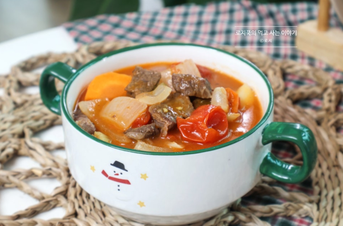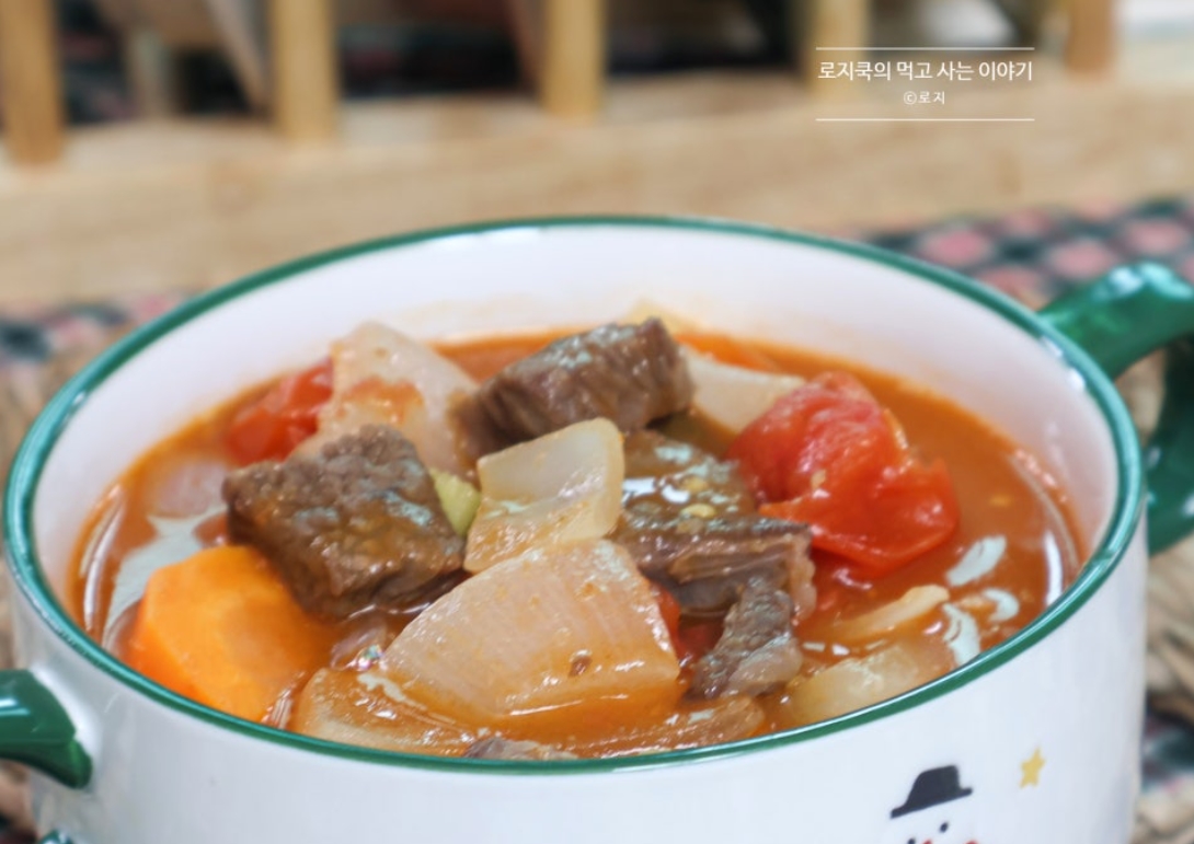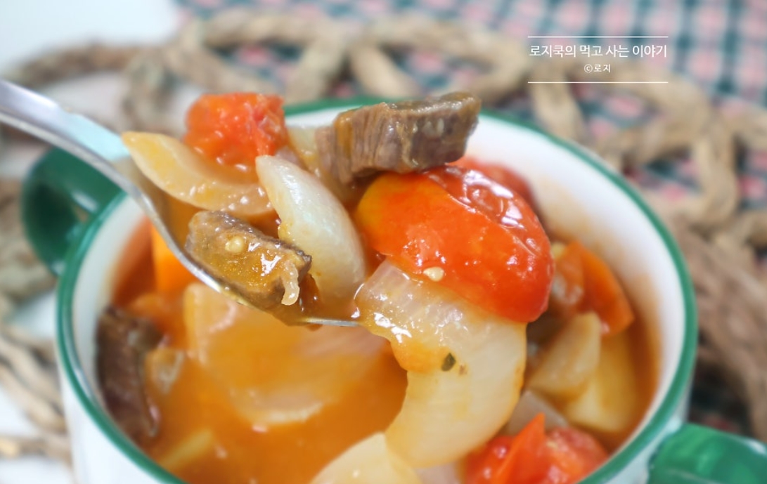오늘은 든든하게 한 끼 식사로 먹기 좋은 소고기 스튜 만드는 법 토마토 스튜 만들기 가지고 왔습니다. 토마토의 산뜻한 맛이 스튜의 국물에 우러나 깊은 맛이 좋습니다. 소고기는 지방이 적은 부위로 아무거나 사용하시면 됩니다.