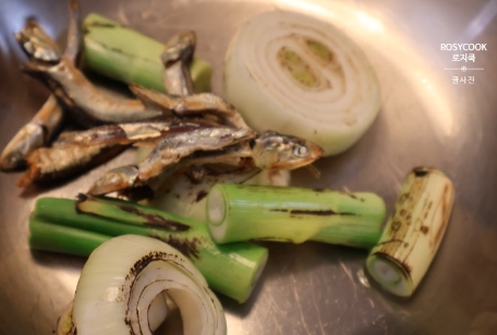 3. 구운 양파, 대파를 넣고 내장을 제거한 굵은 멸치, 건표고버섯을 넣어줍니다. 다시마를 넣어주셔도 좋습니다.