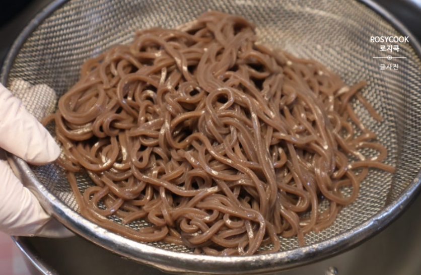 11. 삶은 메밀국수를 찬물에 헹궈서 준비해 줍니다.