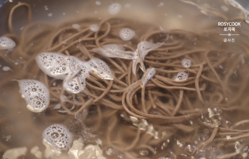 10. 생 메밀국수를 사용했습니다. 물이 끓어오르면 4분 정도 삶아줍니다. 제품에 따라서 삶는 시간이 달라질 수 있으니, 시간은 제품의 뒷면을 참고해 주시면 되겠습니다.