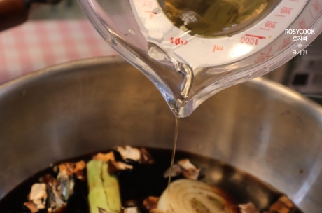 16. 냉동실에 보관해둔 육수를 부어줍니다.