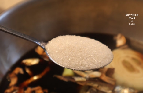 6. 설탕과 혼다시를 넣어줍니다. 혼다시는 가쓰오부시(가다랑어 포) 맛을 내는 조미료입니다. 가다랑어포를 쓰시는 것보다 가성비가 좋습니다. 물론 가쓰오부시를 넣고 끓여주셔도 됩니다.
