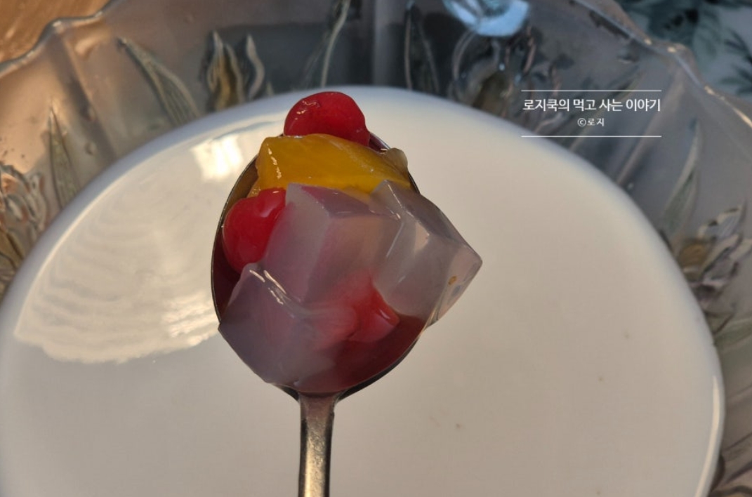 여기에 후르츠칵테일 270g을 국물까지 함께 부어줍니다. 과일이 다양하게 들어가 상큼한 맛이 한층 살아나요.