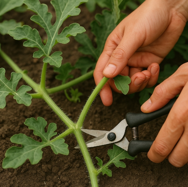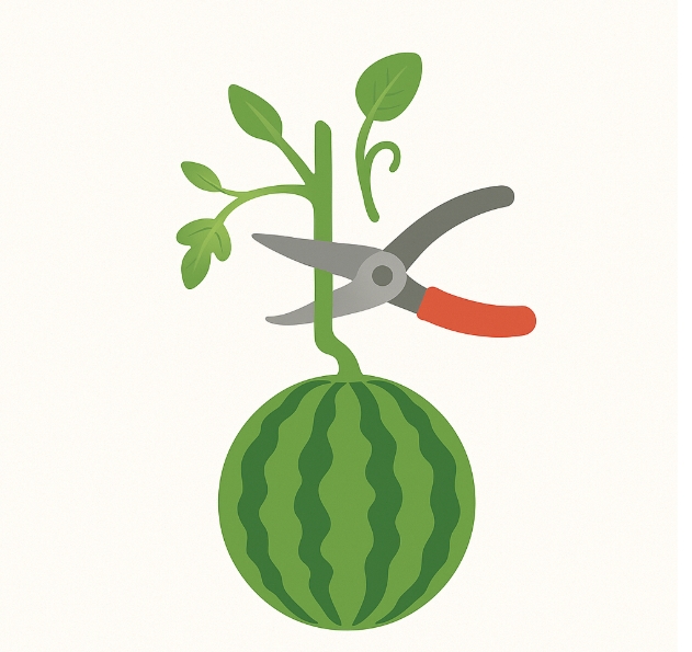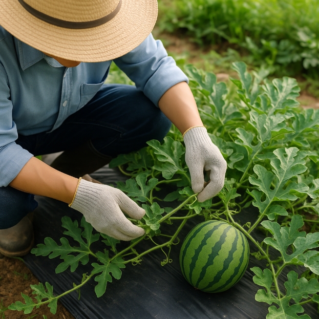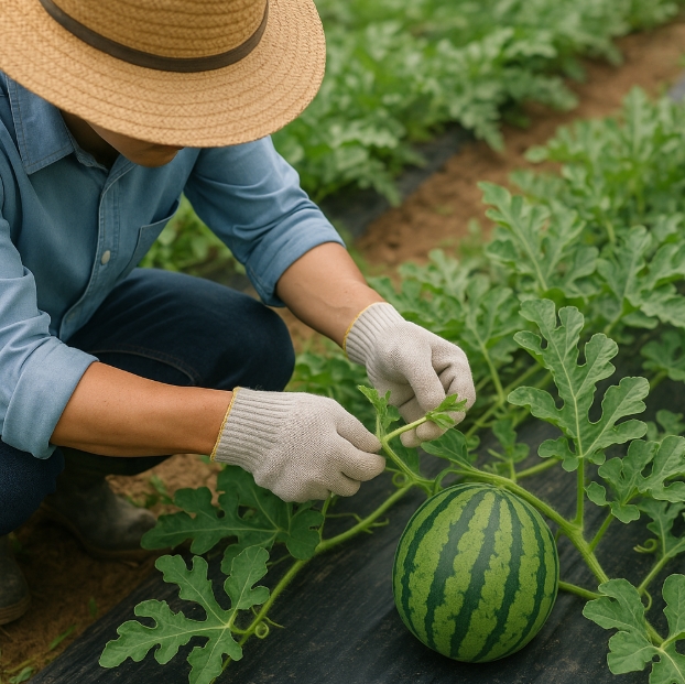 - 착과 순 정하기: 수박은 대부분 7~10마디 부근에서 가장 좋은 품질의 열매가 달립니다. 이 중에서도 크기, 형태가 좋은 것을 선택해 한 포기당 1~2개의 열매만 집중적으로 키우는 것이 좋아요.