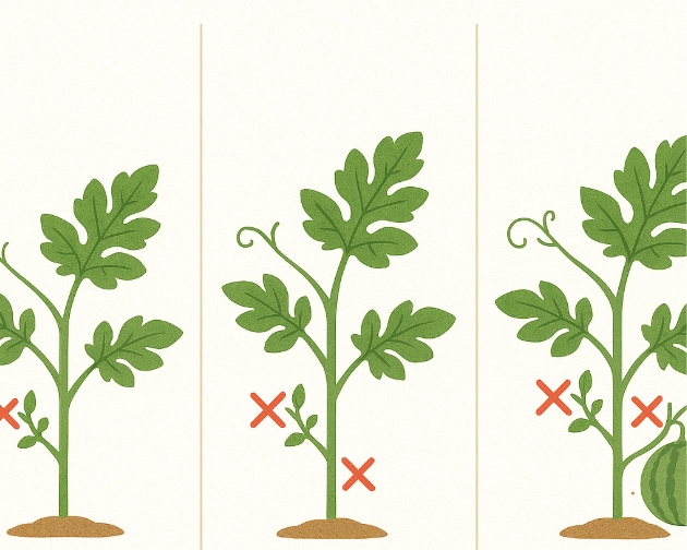 수박 순치기는 한 번으로 끝나는 작업이 아닙니다. 아래와 같이 시기별로 나누어 순차적으로 진행하는 것이 좋아요.