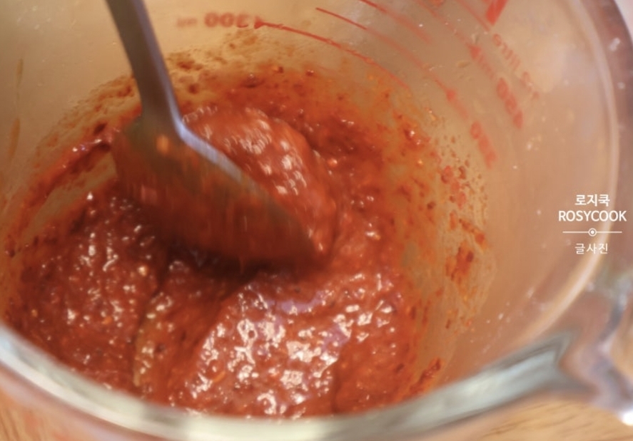 3. 고춧가루, 고추장을 넣고, 끓고 있는 육수 1국자를 섞어 풀어줍니다.