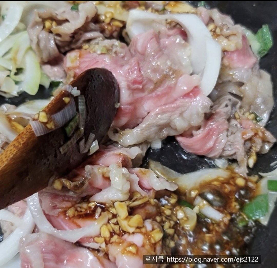 12. 양파와 차돌박이에 만들어둔 숙주 차돌박이 볶음 소스를 두 큰 술 정도 넣고 먼저 볶아줍니다.