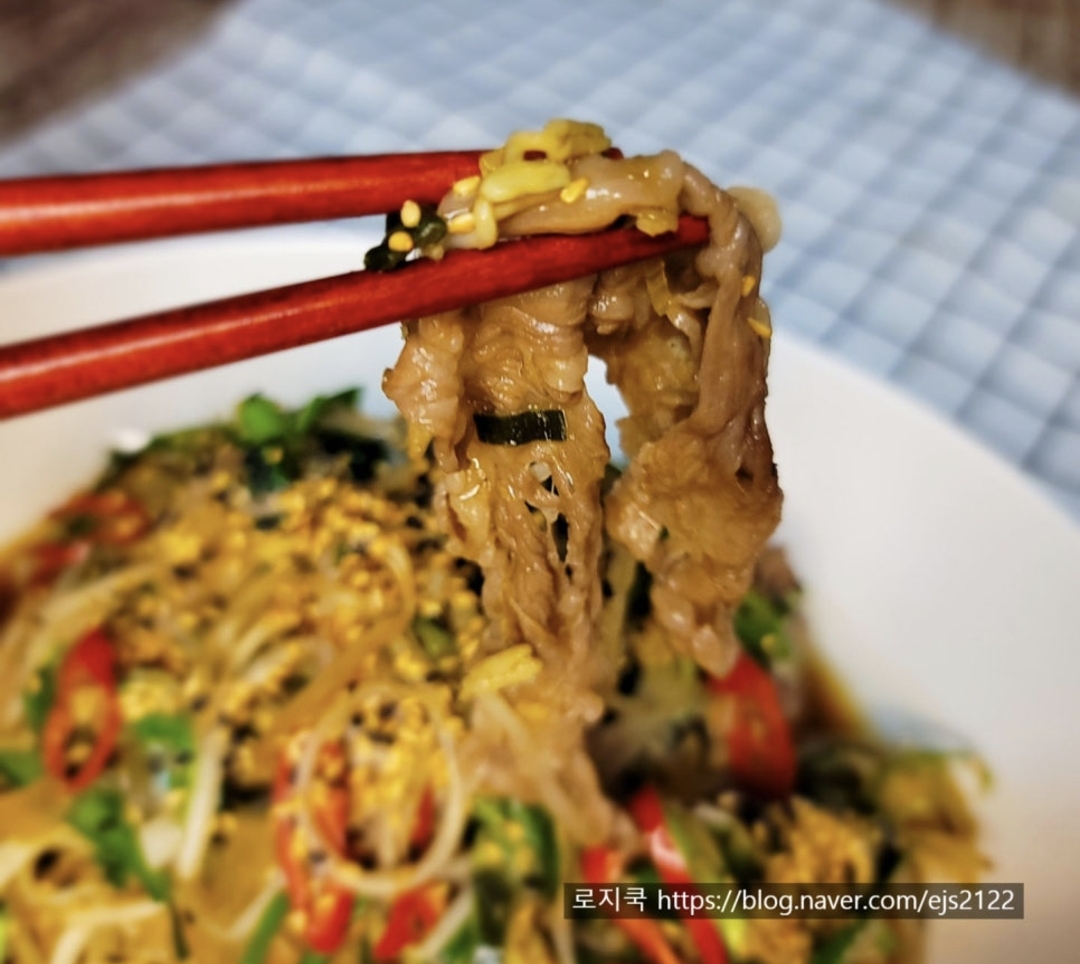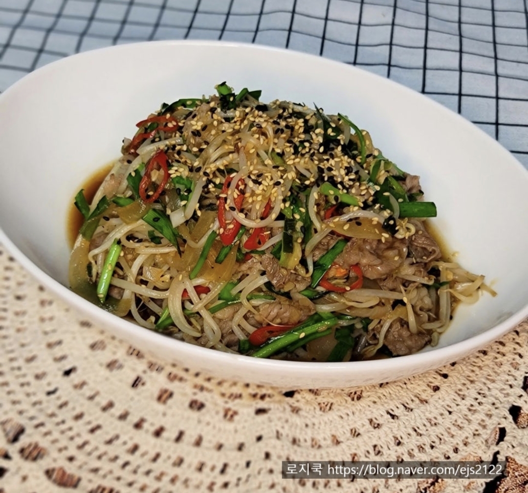 숙주나물의 아삭아삭 씹히는 식감이 차돌박이와 아주 잘 어울립니다. 차돌박이 특유의 풍미와 간장 소스가