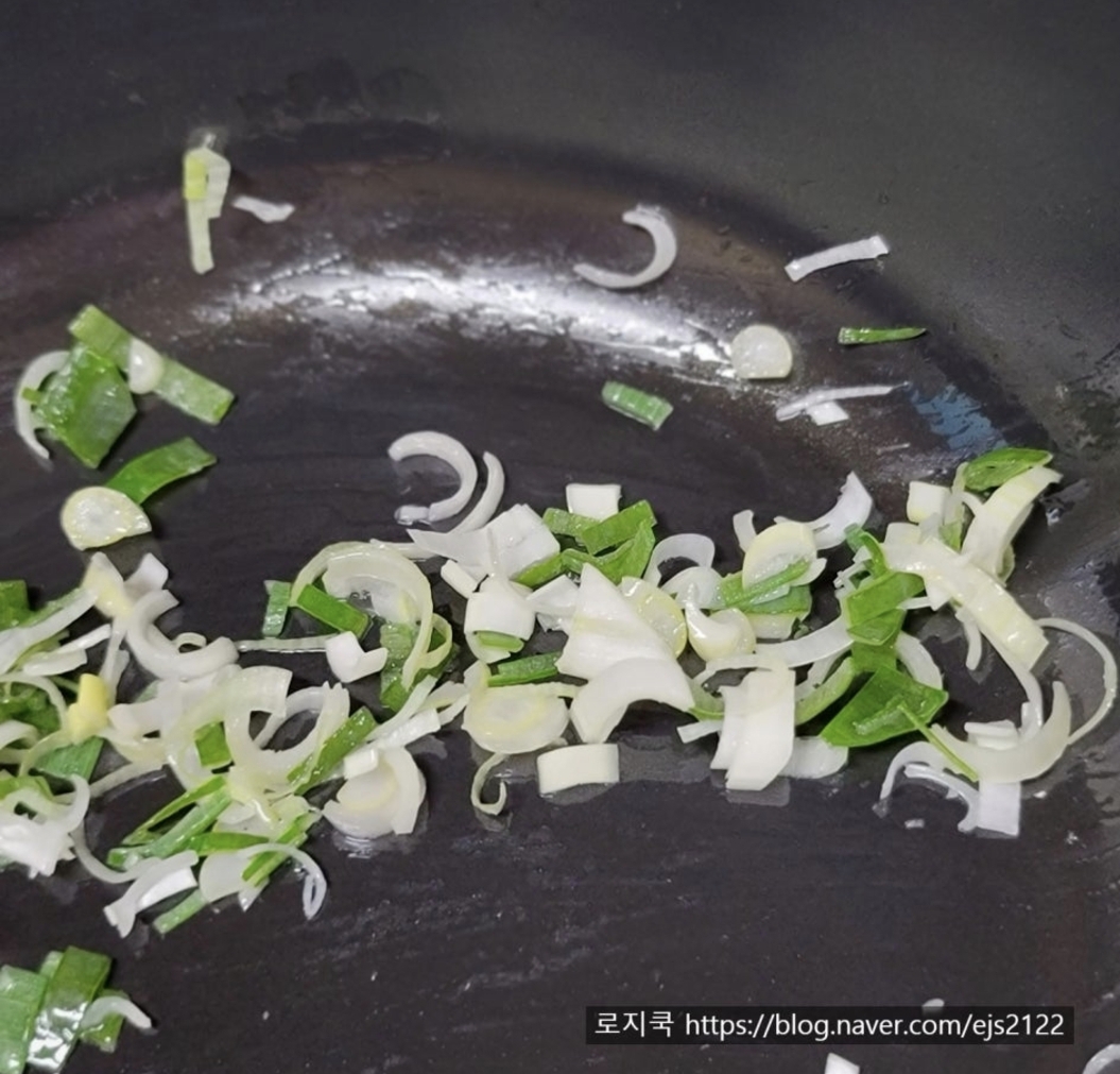 10. 식용유를 붓고 파 기름을 살짝 내줍니다. 차돌박이에서 기름이 나오기 때문에 많은 양은 필요 없습니다.