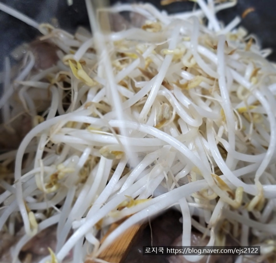 13. 고기가 어느 정도 익은 후에 세척하면서 손질해둔 숙주나물을 넣어줍니다. 물기를 완전히 뺀 후 넣어주셔야 합니다.