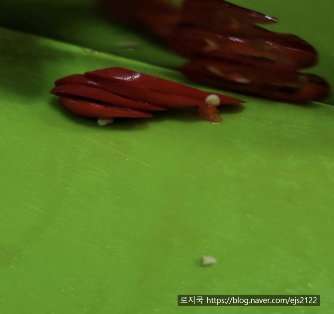 4. 홍고추와 청양고추도 세척 후, 썰어줍니다. (1개 씩)