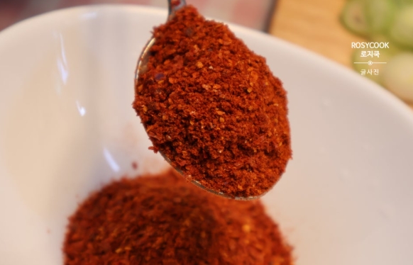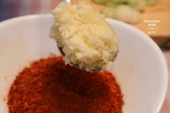 4. 고춧가루 3 큰 술과 간 마늘 1 큰 술을 넣어줍니다.