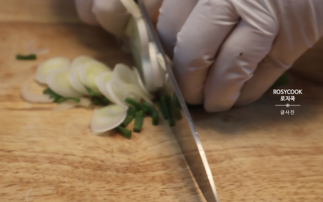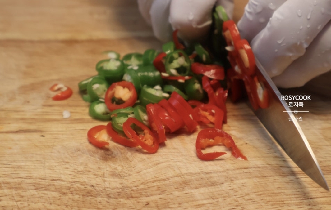 4. 대파 1/2대를 송송 썰어주고, 청양고추 2개와 홍고추 1개도 썰어줍니다.
