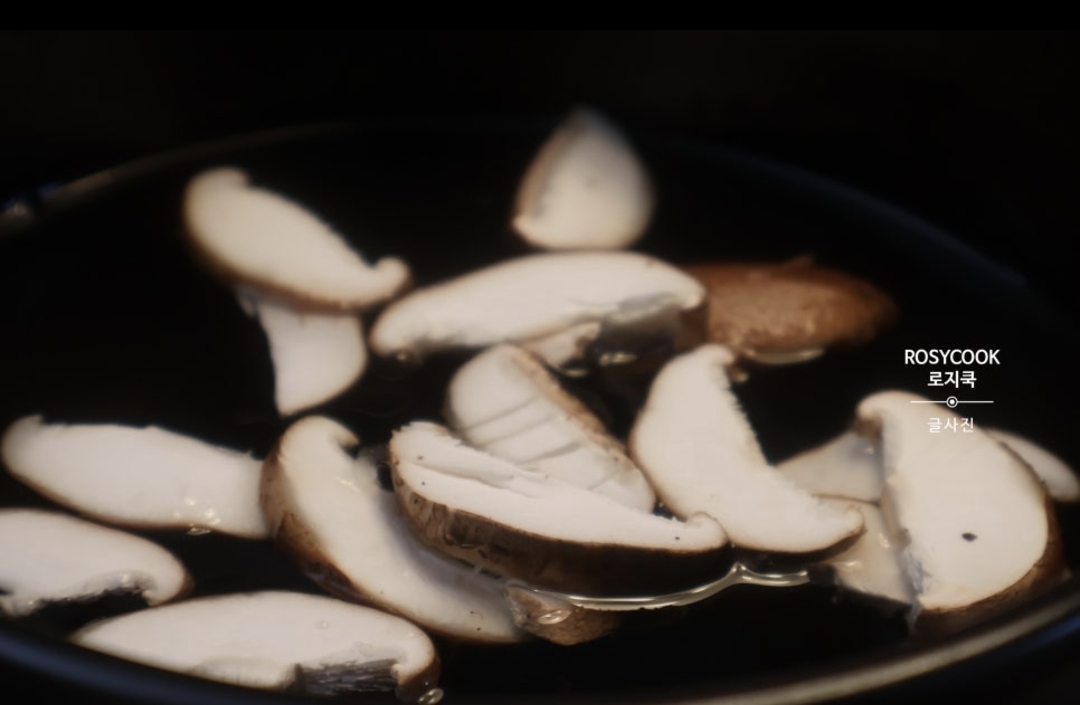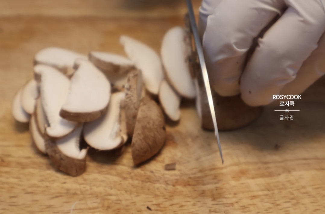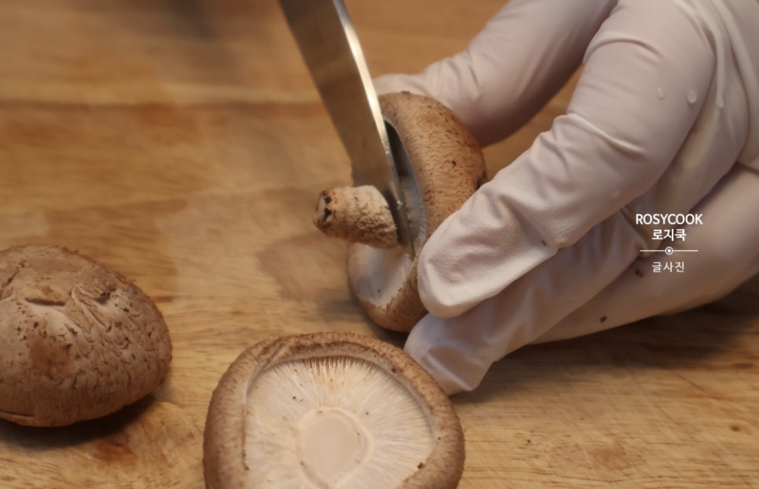 3. 표고버섯 2개의 기둥을 제거한 후, 적당한 두께로 썰어줍니다.