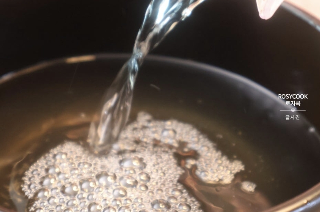 5. 끓여둔 야채수를 체로 걸러서 부어준 후, 물 250ml를 추가로 부어줍니다.