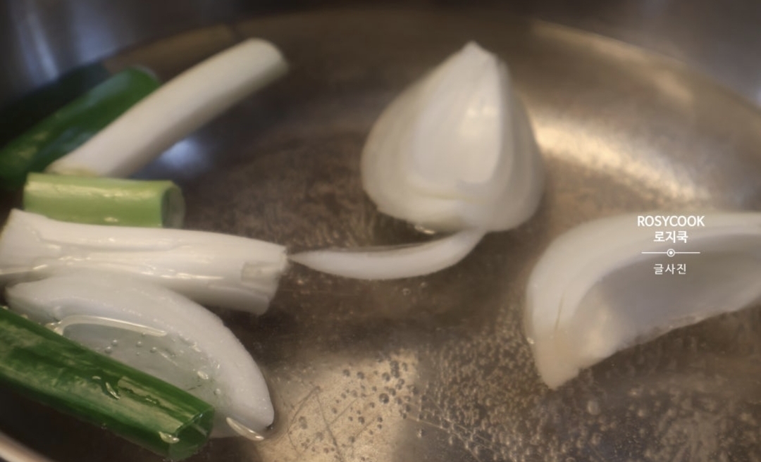 1. 물 800ml를 붓고, 대파 1/2대와 양파 1/2개를 썰어서 넣어줍니다.