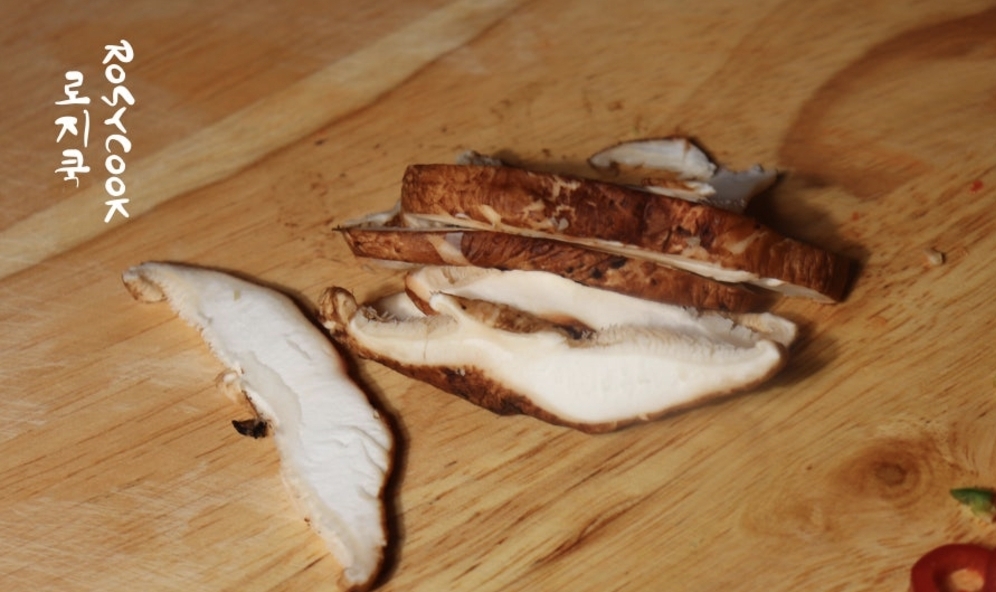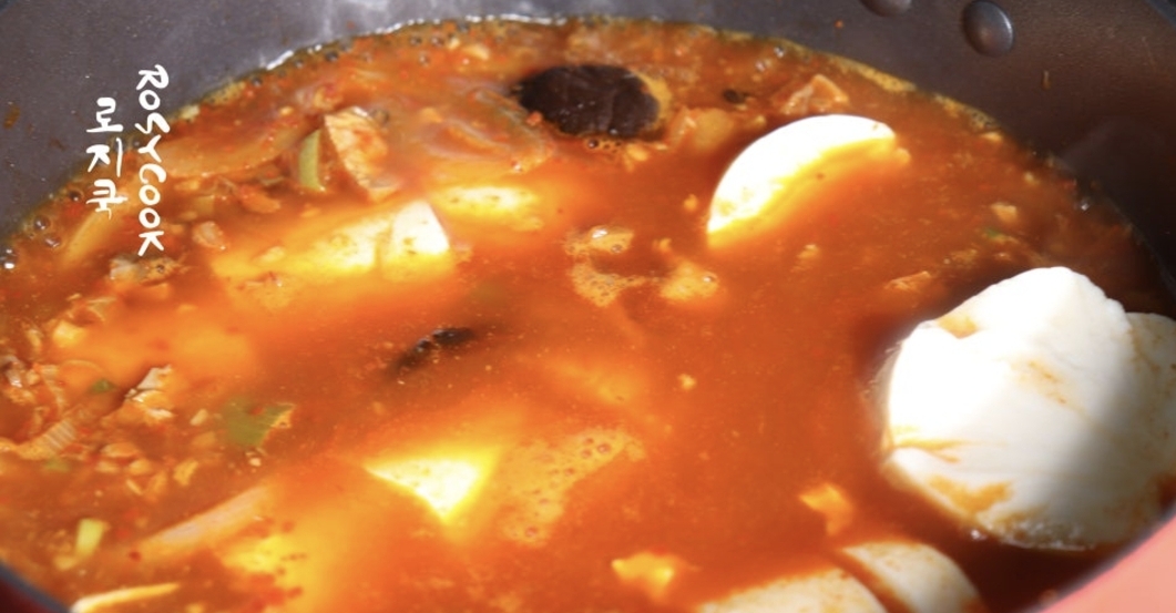 5. 표고버섯을 넣고 한소끔 끓이다가, 순두부를 조심스럽게 넣습니다. 실리콘 주걱이나 숟가락으로 크게 으깨지지 않게 잘라주세요.