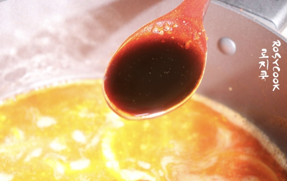 4. 물 550ml 붓고 끓기 시작하면 국간장과 양조간장으로 간을 맞춰주세요.