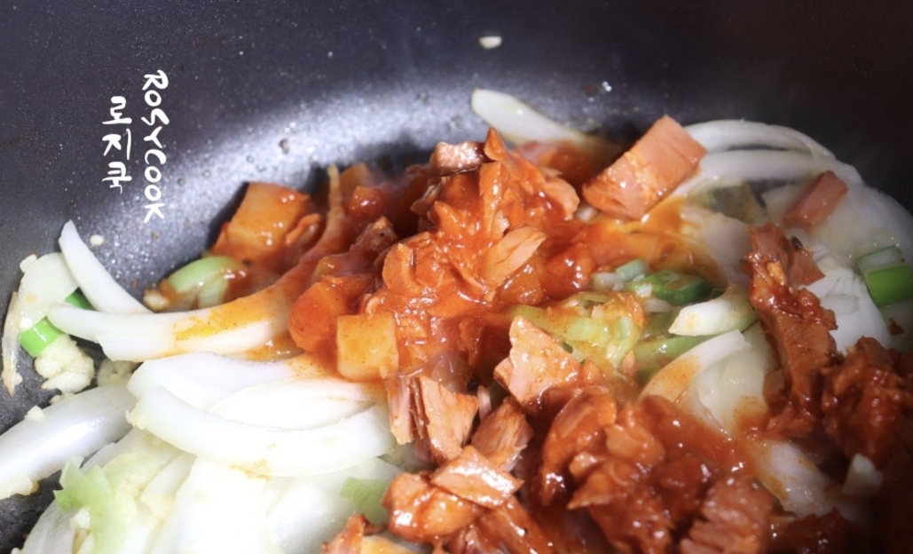 3. 다진 마늘, 양파를 차례대로 넣고 볶다가, 고추참치를 넣고 고춧가루도 함께 볶아주세요. 이때 고추기름 향이 아주 진하게 올라와요.