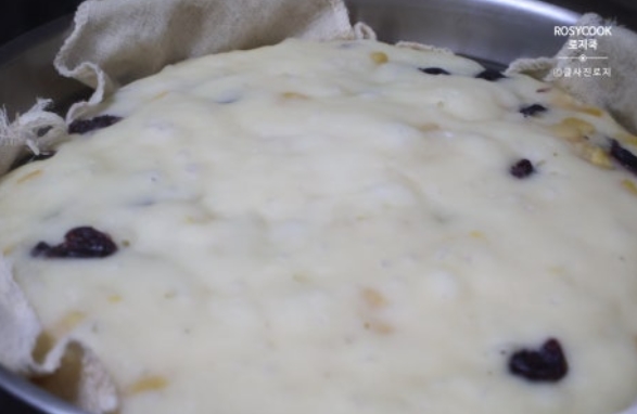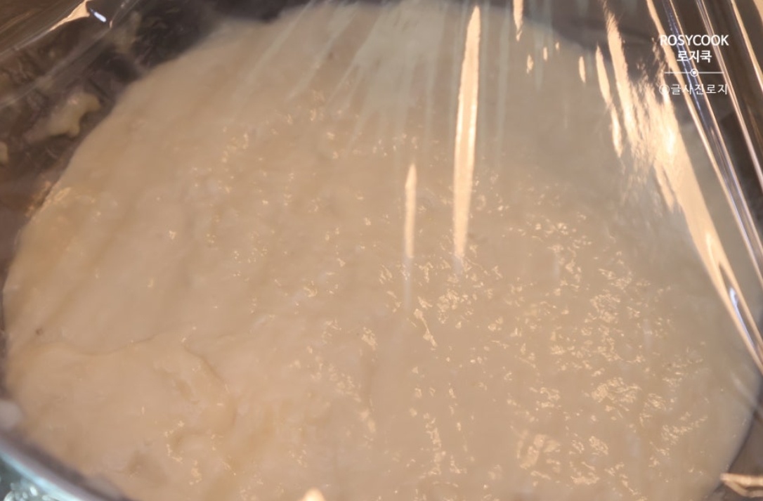8. 랩을 씌워서 따뜻한 곳에서 발효합니다. 겨울엔 전기매트 위에서 발효하면 좋습니다. 날씨에 따라서 시간은 달라지겠지만 이스트를 사용할 경우 3시간 ~ 4시간 정도 발효해주시면 됩니다. 막걸리만 사용하신다면 6시간 정도 발효해 주시면 됩니다.