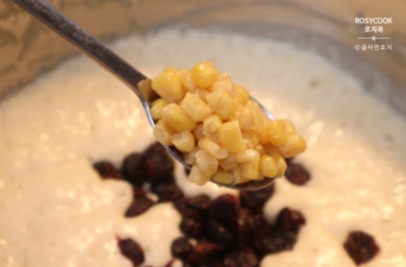 10. 건포도 5 큰 술, 캔옥수수 국물을 뺀 후 5 큰 술을 넣어줍니다.