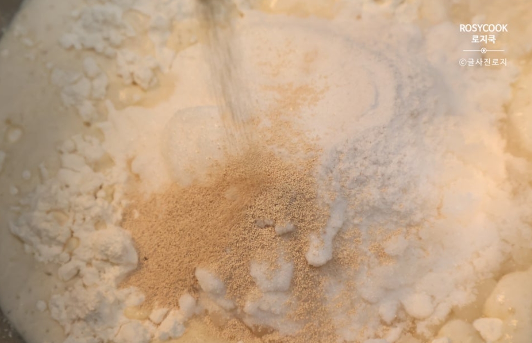 11. 버무려가며 섞어줍니다. 잘 발효가 되었다면 이렇게 반죽이 끈적끈적하고 잘 늘어납니다.
