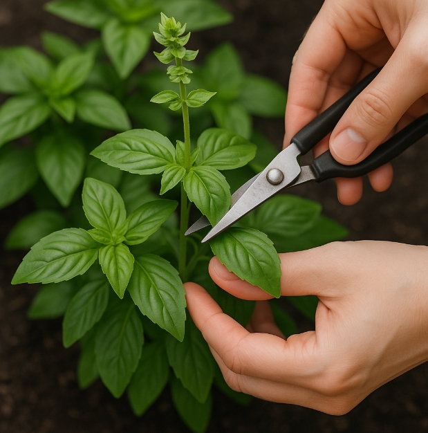 이때 꽃을 그대로 두면 잎이 질겨지고 향이 약해지니, 꽃대는 미리 잘라주는 게 좋아요. 그리고 정기적으로 가지치기(순지르기)를 해주면 바질이 옆으로 더 풍성하게 자랍니다.