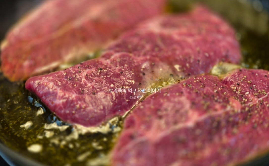 4. 팬에 예열되면, 마리네이드 해둔 소고기를 올려줍니다.