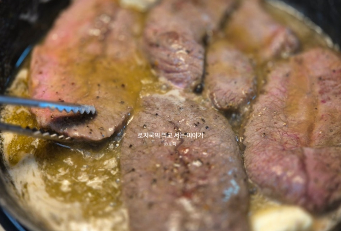 6. 소고기의 겉이 어느 정도 익었을 때 버터를 끼얹으면서 구워주시면 됩니다. 한 덩이당 40g ~ 80g을 사용하시면 됩니다. 3분 정도 조리해 주세요. 후에 레스팅할 것을 감안하고 시간을 조절해 줍니다.