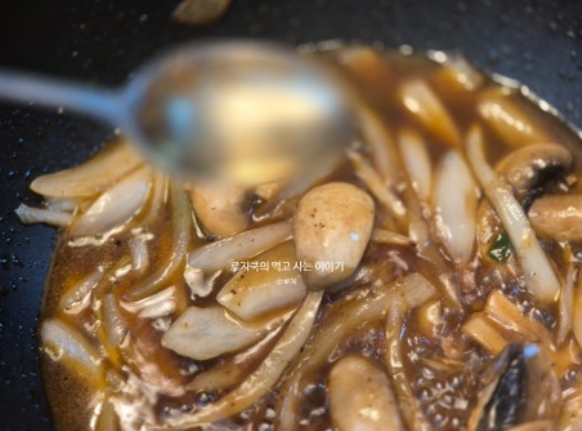 14. 물을 붓고, 설탕, 맛술(미림)을 넣어줍니다. 소스가 걸쭉해질 때까지 끓여줍니다.
