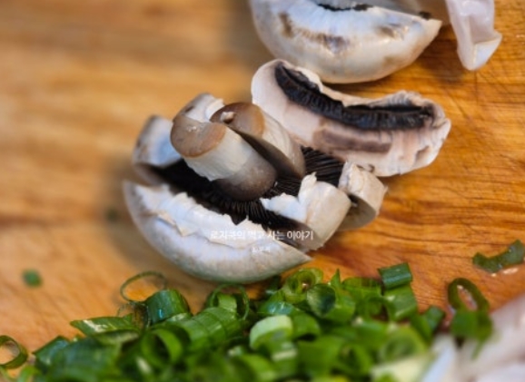 9. 파를 송송 썰어주시고, 양송이버섯도 적당한 두께로 썰어줍니다.