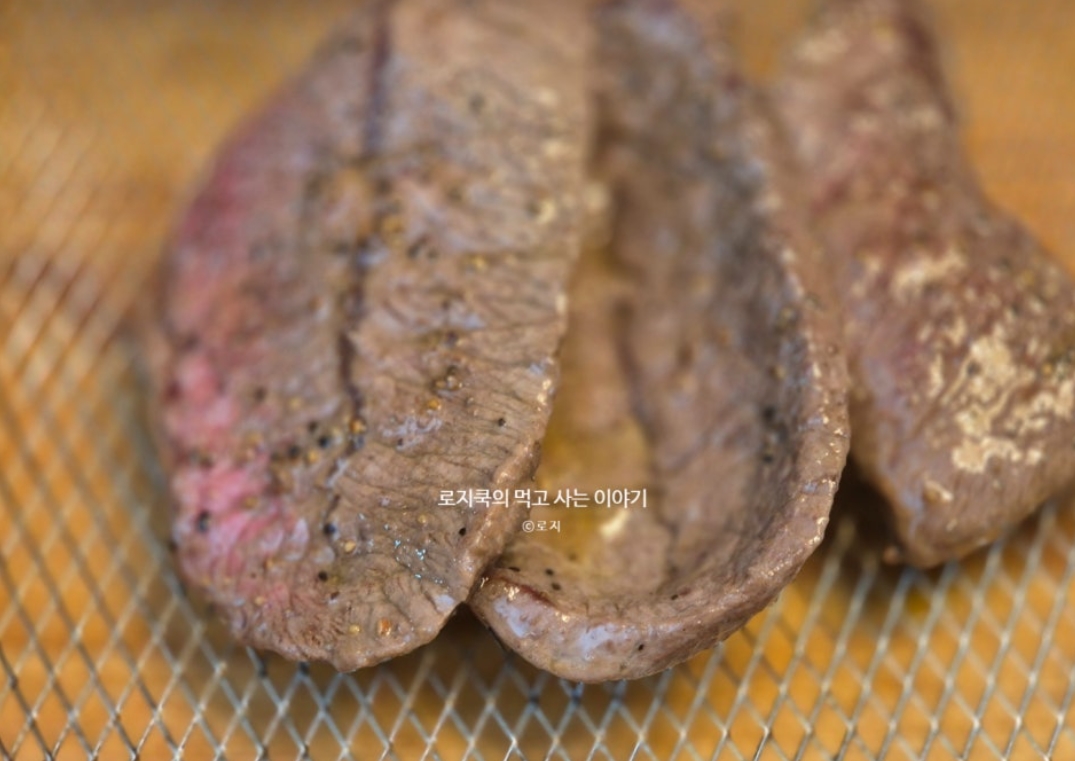 고기 중심에 모여있는 수분이 전체적으로 퍼지면서 심부 온도가 올라가 고기가 익게 되기 때문입니다. 굽기 조절은 스테이크를 구우면서 눌러보시면 되는데, 익을수록 고기가 단단해지기 때문에 눌러보면서 취향에 맞게 조절해 줍니다. 제가 사용한 부채살은 두껍지 않아서 굽는 시간을 오래 잡지 않았습니다.
