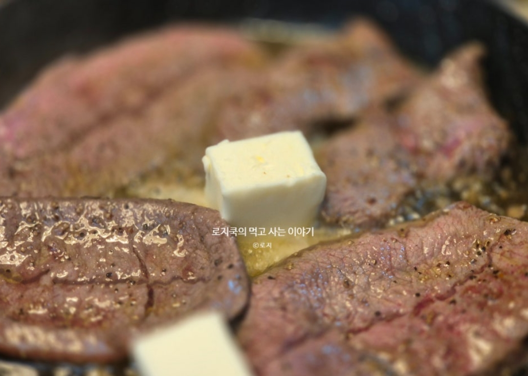 6. 소고기의 겉이 어느 정도 익었을 때 버터를 끼얹으면서 구워주시면 됩니다. 한 덩이당 40g ~ 80g을 사용하시면 됩니다. 3분 정도 조리해 주세요. 후에 레스팅할 것을 감안하고 시간을 조절해 줍니다.